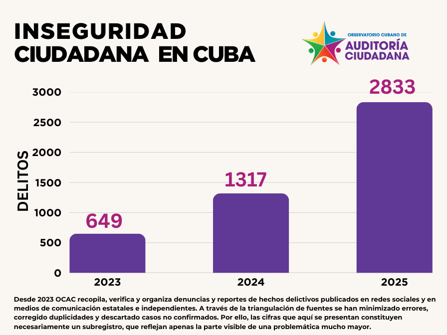 Durante 2025, la inseguridad pública en Cuba dejó de ser un fenómeno coyuntural para consolidarse como un problema estructural, sostenido y en expansión. Así lo confirma el más reciente informe del Observatorio Cubano de Auditoría Ciudadana (OCAC), que sistematiza, verifica y analiza reportes de hechos delictivos publicados en redes sociales y medios de comunicación estatales e independientes entre enero y diciembre del año.