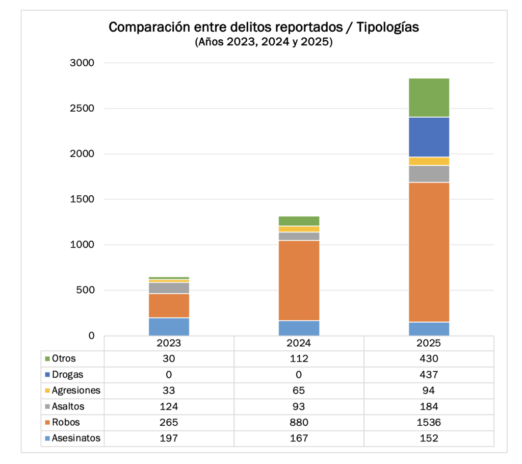 Durante 2025 se reportaron 184 asaltos y 94 agresiones, ambas categorías con incrementos significativos respecto a años anteriores. Los asaltos crecieron 97,85 % frente a 2024, mientras que las agresiones aumentaron 44,62 % en el mismo período y casi se triplicaron en comparación con 2023.