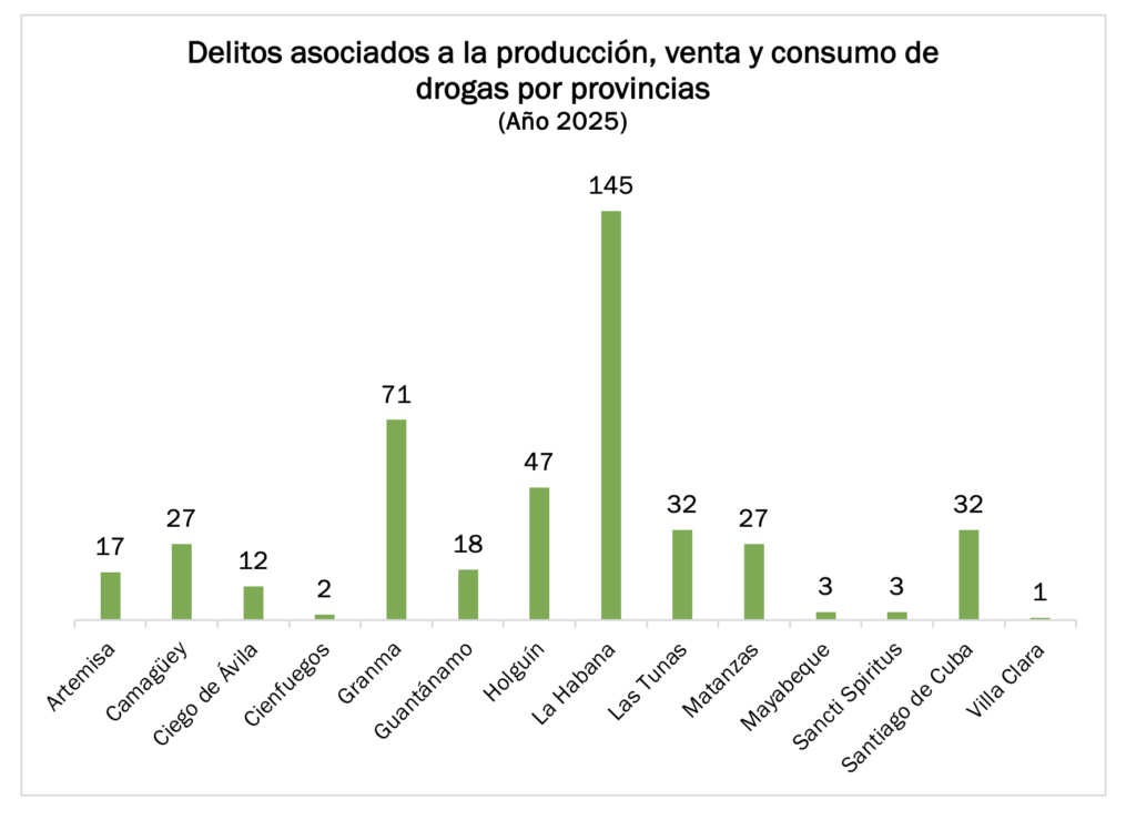 Las provincias con mayor número de reportes a lo largo del año fueron Matanzas (503), Granma (424), La Habana (398) y Santiago de Cuba (323). El desplazamiento de la criminalidad hacia territorios del centro-oriente y oriente del país constituye uno de los cambios territoriales más relevantes respecto a años anteriores y apunta a una ampliación del mapa delictivo hacia zonas con mayores niveles de precariedad material.