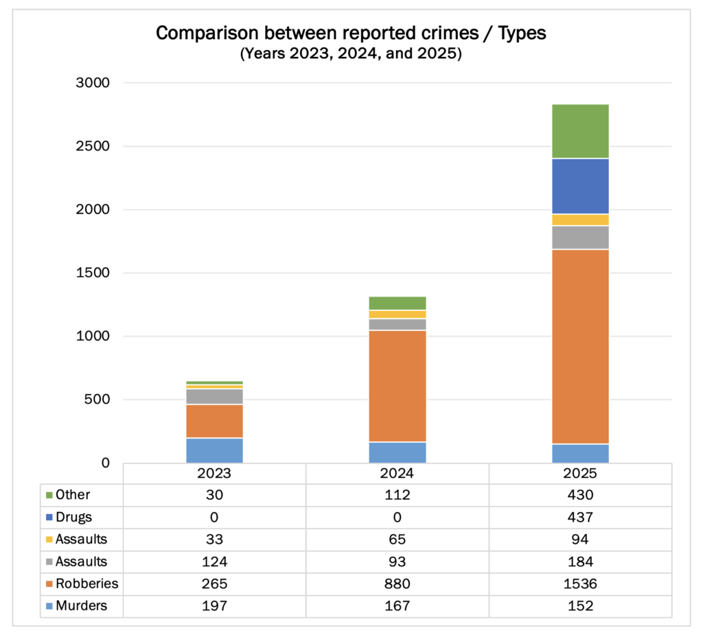 Robbery remained the dominant criminal category. In 2025, 1,536 robberies were reported, representing a 74.55% increase over 2024 and a 479.62% increase compared to 2023. This explosive growth makes crimes against property the most sensitive indicator of social deterioration and institutional breakdown.