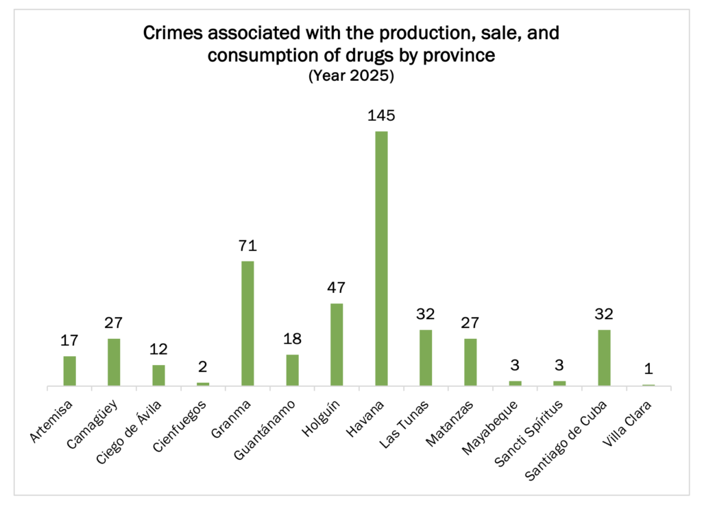 Havana led with 145 reports, followed by Granma (71) and Holguín (47), confirming both the capital’s continued centrality and the expansion of drug-related activity into eastern provinces. Synthetic cannabinoids (“chemical” or “paper”) and marijuana predominated—substances characterized by low cost, high availability, and strong penetration among young people.