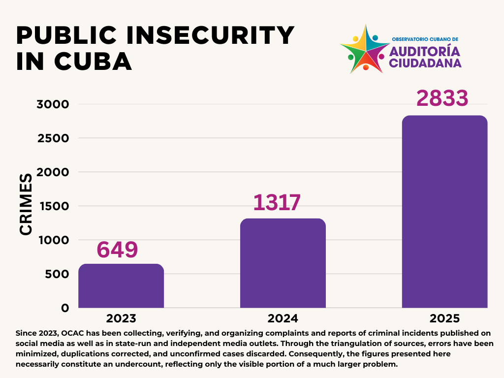 Throughout 2025, public insecurity in Cuba ceased to be a temporary or circumstantial issue and became consolidated as a structural, sustained, and expanding phenomenon. This is confirmed by the latest report from the Cuban Observatory of Citizen Auditing (OCAC), which systematically compiles, verifies, and analyzes reports of criminal incidents published on social media and in both state-run and independent media outlets between January and December of the year.